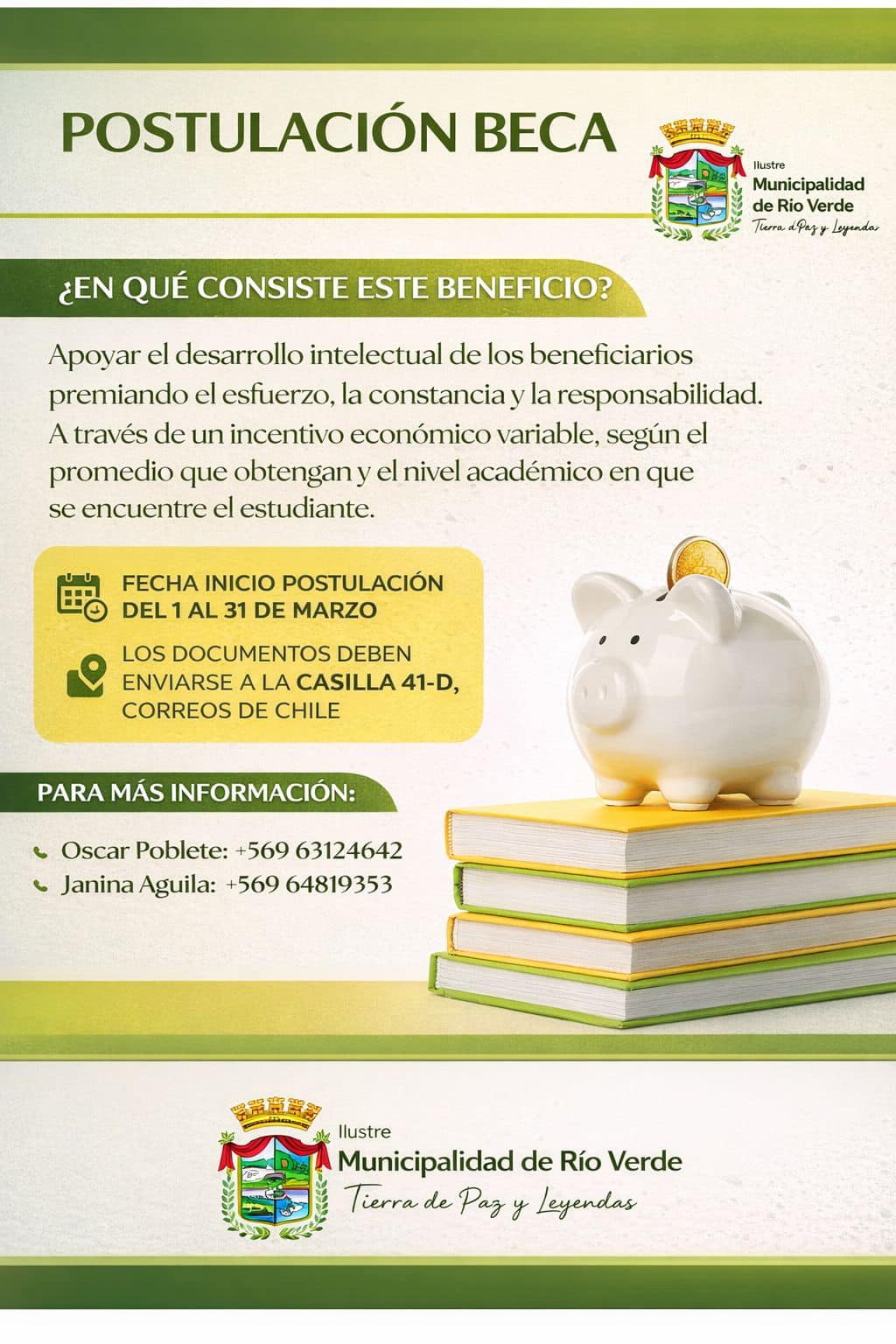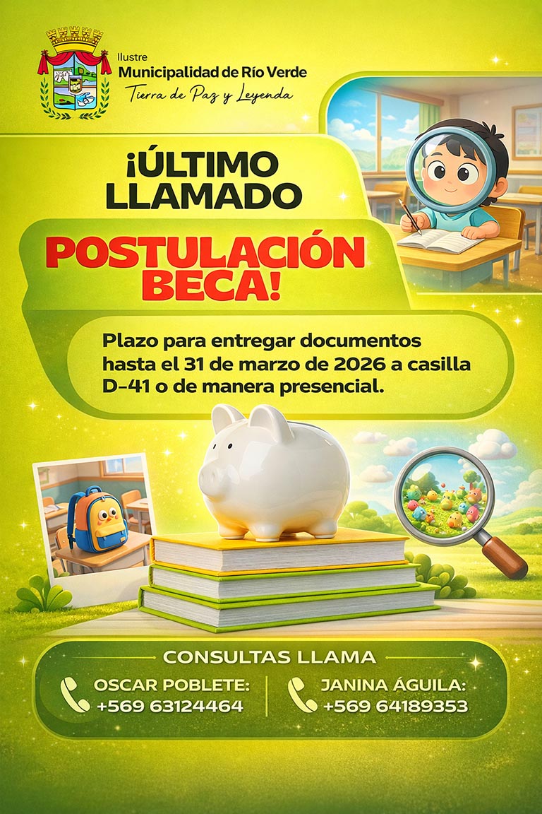 Estimada comunidad, junto con saludar, les dejamos la información correspondiente al Proceso de Beca Municipalidad de Rio Verde 2026.