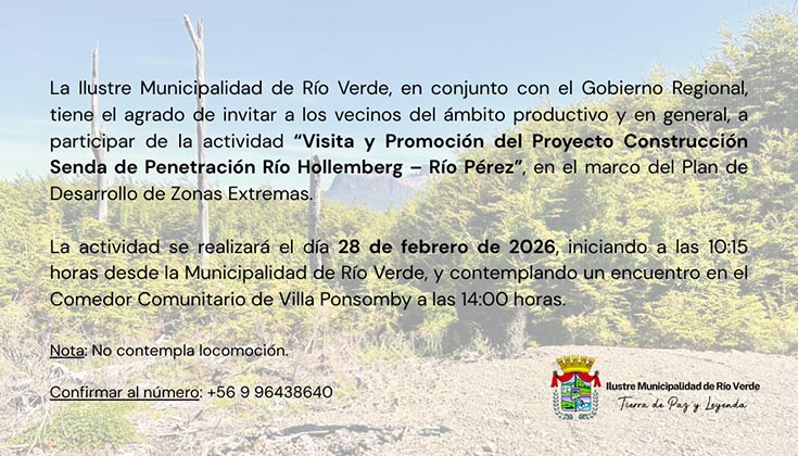 Estimada Comunidad, junto con saludarlos, tenemos el agrado de invitarlos a la actividad denominada: “Visita y Promoción del Proyecto Construcción Senda de Penetración Río Hollemberg-Río Pérez” a realizar el 28 de febrero.