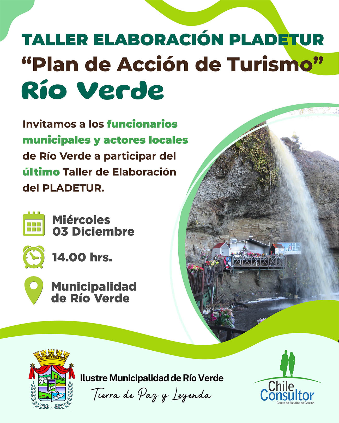 Estimada Comunidad, invitamos a todos los actores locales de Río Verde al Taller de Elaboración PLADETUR: "Líneas estratégicas y cartera de proyectos”, a realizarse este miércoles 03 de diciembre de 2025 a las 14:00 horas, en dependencias de nuestra municipalidad.