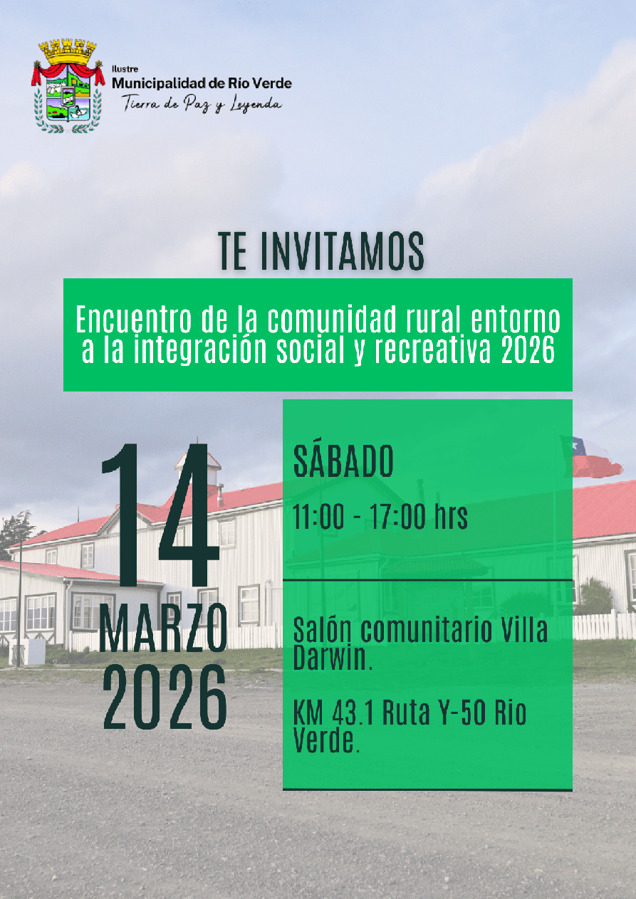 Estimados Vecinos y Vecinas, junto con saludar, tenemos el agrado de invitarlos a la actividad denominada: “Encuentro de la Comunidad Rural entorno a la integración social y recreativa 2026” a realizarse el día 14 de marzo del presente año, desde las 11 horas, en el Salón Comunitario de Villa Darwin.