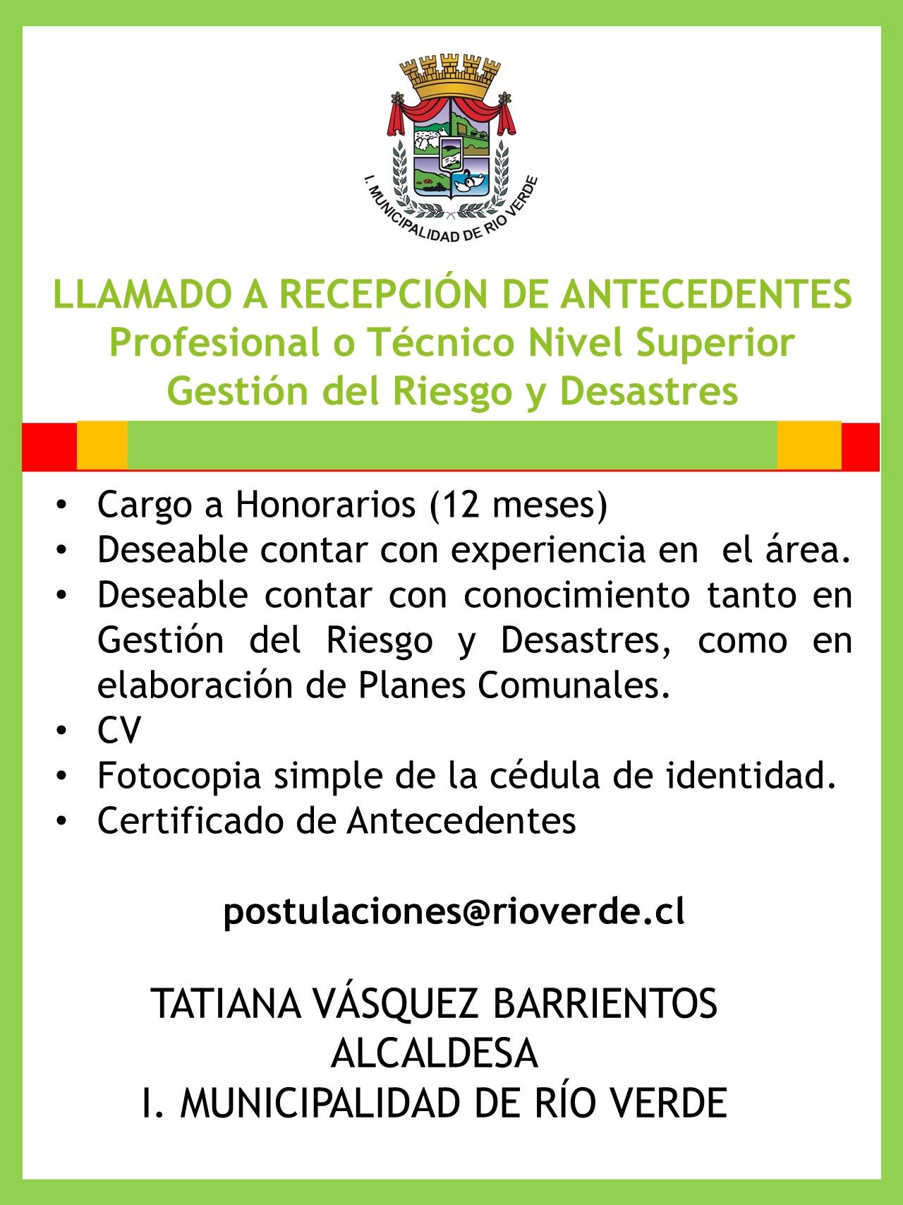 Abrimos llamado a recepción de antecedentes para Profesional o Técnico Nivel Superior Gestión de Riesgo y Desastres.